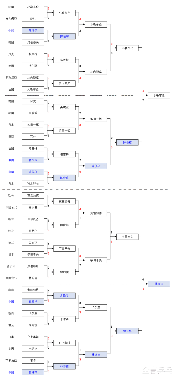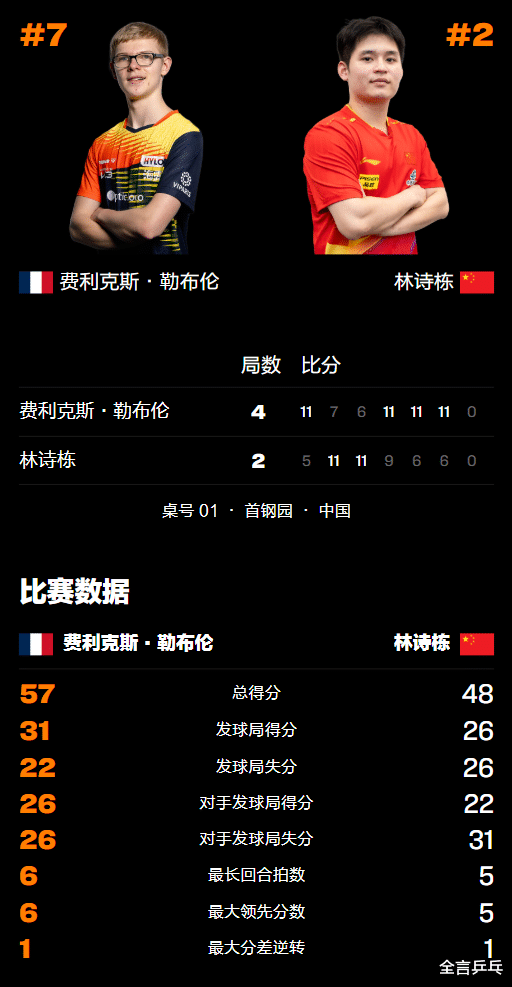 第三局林诗栋坚定执行正手突破的战术,很快便2-0领先随后6-2拉开差距,中间段遭到对方反攻追至7-5只差2分,紧接着9-5、10-6领先后拉高吊球加转逼小勒布伦反手进攻失误再得1分,由此而以11-6取胜反超对手。